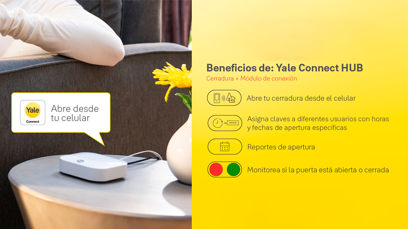 El módulo HUB permite conectar tu cerradura YALE con Zigbee a internet, integrarla con tu celular y controlarla a distancia. Con este módulo puedes abrir o cerrar la puerta. crear claves, validar accesos (entre otros) desde cualquier lugar, recibir notificaciones en tiempo real, usar asistentes de voz (Alexa, Google Home). Sin este módulo y el Zigbee, el control via celular no estará disponible.